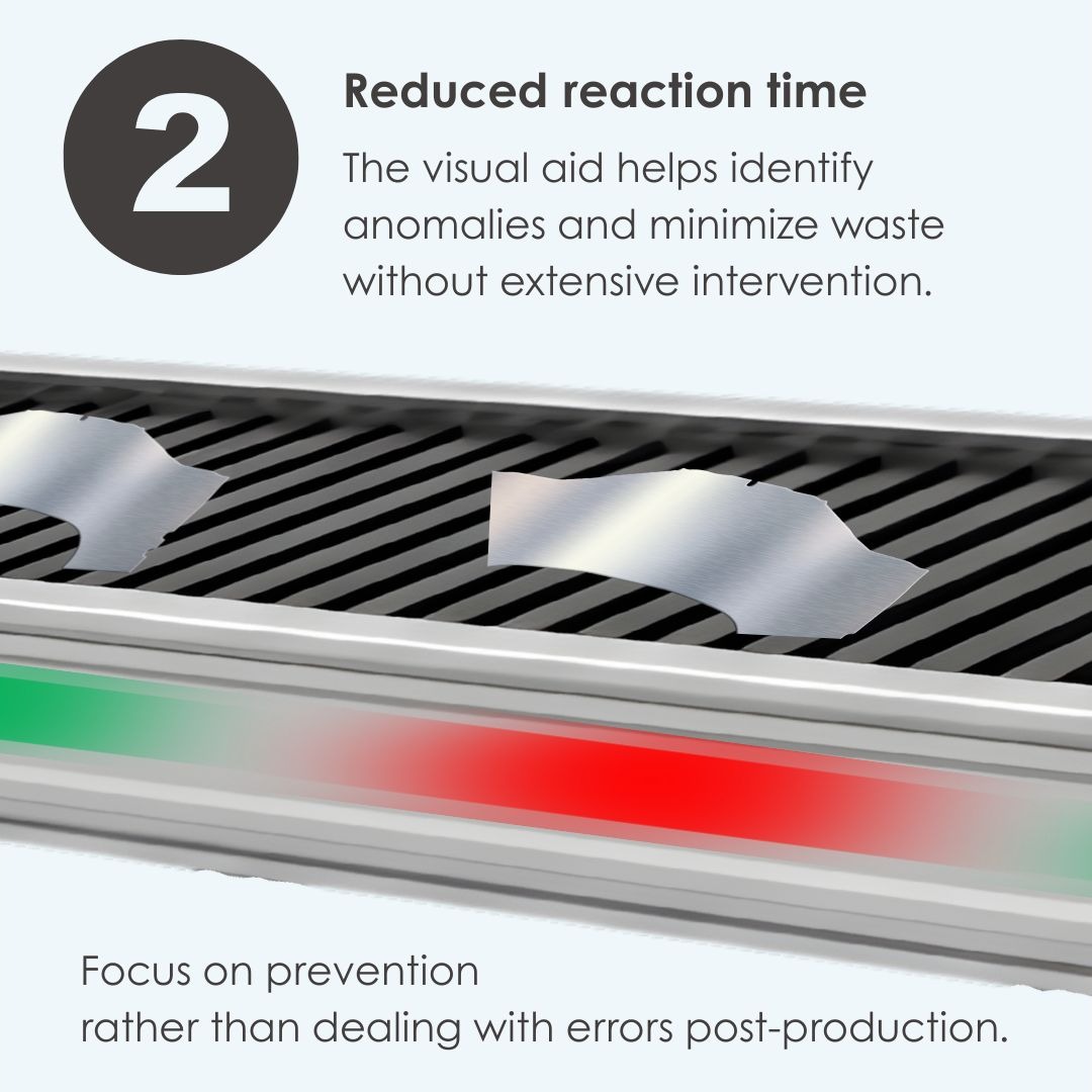 - When a product passes inspection (via a camera or sensor), the LED stripe lights up green above it; if it fails QC, it lights red. Pulsating light mode is available in case of color-blindness.