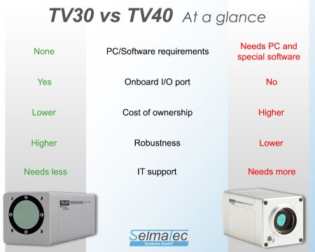 Nevertheless, at Selmatec, we understand that every customer's needs are unique, and we are ready to offer optimized solutions. While the TV30 camera has various improvements, the TV40 model is still available in our catalogue, due to qualities that provide an advantage in particular cases (for example, processes that require field interchangeable lenses or high computing power).