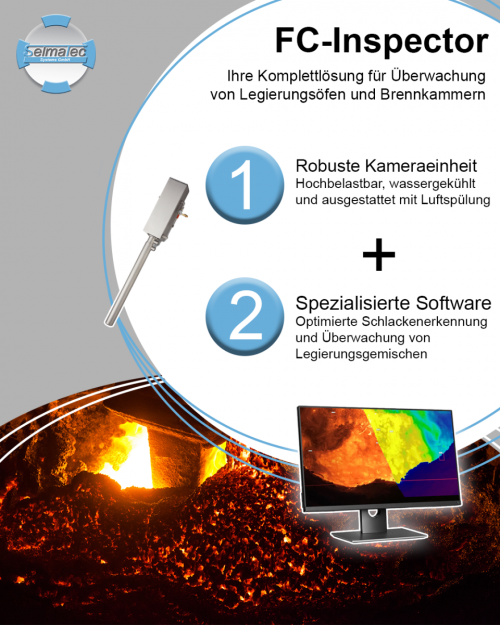 Der FC-Inspector stellt dafür die ideale Lösung dar. Eine robuste Kameraeinheit, mit anwendungsspezifischer Software zur Echtzeit-Bildanalyse kombiniert, sorgt für ein problemloses Überwachen der Legierungspfannen. So werden Unregelmäßigkeiten sofort erkannt und Ihr Legierungsverfahren optimiert.