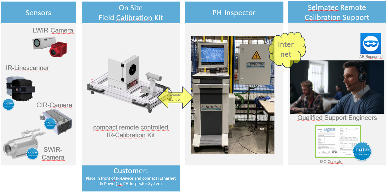 Die Fernkalibrierung gewährleistet langfristige Zuverlässigkeit und Genauigkeit für die von Ihnen gewählten Lösungen. Kunden erhalten ein Kalibrierungskit mit einem Schwarzkörper und einer Halterung für die Geräte, das eine einfache Handhabung und Vielseitigkeit garantiert. Wenn Sie sich beispielsweise für unsere PH-Inspector-Lösung entscheiden, die Linienscanner (MP-Modell) und IR-Kameras (LWIR- und CIR-Modelle) verwendet, kann jedes dieser Geräte auf dem Kalibrierungskit montiert werden. Sobald eine Internetverbindung besteht, greifen qualifizierte Ingenieure über TeamViewer sicher auf das System zu, um präzise Kalibrierungen durchzuführen und so die maximale Leistungsfähigkeit Ihrer Geräte zu gewährleisten.