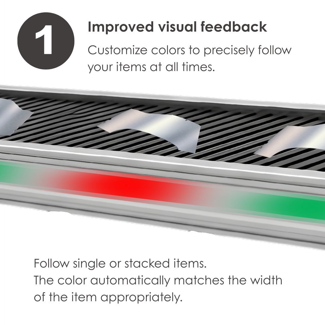 - When a product passes inspection (via a camera or sensor), the LED stripe lights up green above it; if it fails QC, it lights red. Pulsating light mode is available in case of color-blindness.