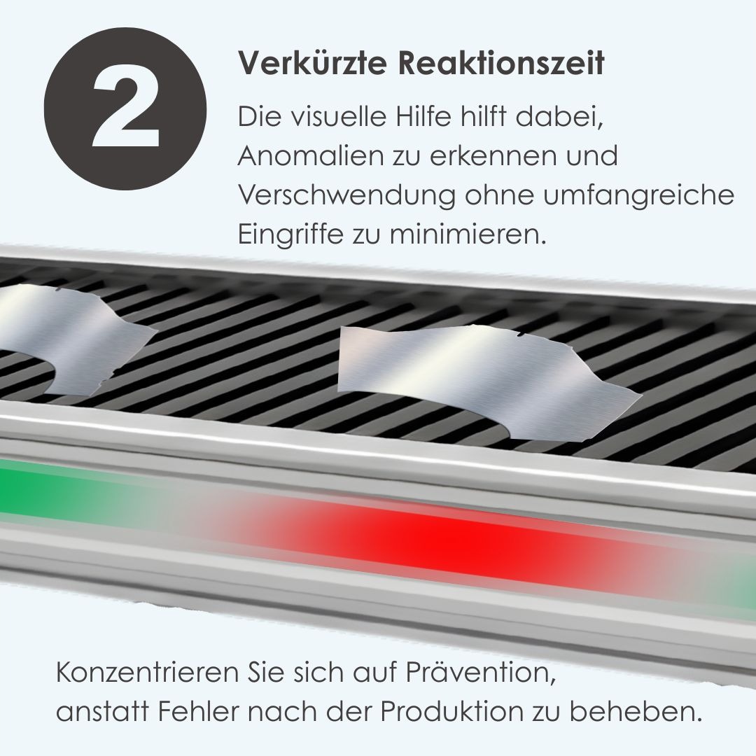 - Wenn ein Produkt die Prüfung (über eine Kamera oder einen Sensor) besteht, leuchtet der LED-Streifen darüber grün auf; wenn es die Qualitätskontrolle nicht besteht, leuchtet er rot. Für den Fall einer Farbenblindheit ist ein pulsierender Lichtmodus verfügbar.
