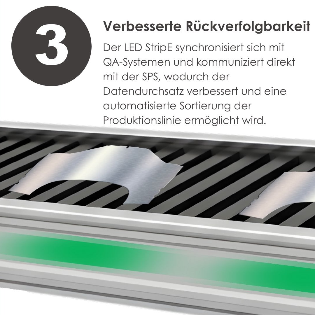 Sie installieren den LED StripE neben Ihrem bestehenden Förderband, verbinden ihn mit Ihrem Qualitätskontroll- (QC) oder Sortiersystem und schon wird er zu einer unverzichtbaren visuellen Hilfe für die Sicherung Ihrer Produktion. Er ist skalierbar und kann auf bis zu 30 Meter verlängert werden, in 2-Meter-Segmenten, wenn Sie eine modulare Anordnung bevorzugen.
