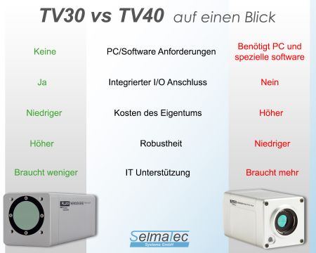 Wir bei Selmatec wissen jedoch, dass die Bedürfnisse jedes Kunden einzigartig sind, und wir sind bereit, optimierte Lösungen anzubieten. Während die TV30-Kamera verschiedene Verbesserungen aufweist, ist das Modell TV40 weiterhin in unserem Katalog erhältlich, da es in bestimmten Fällen (z. B. bei Prozessen, die austauschbare Objektive oder eine hohe Rechenleistung erfordern) von Vorteil ist.